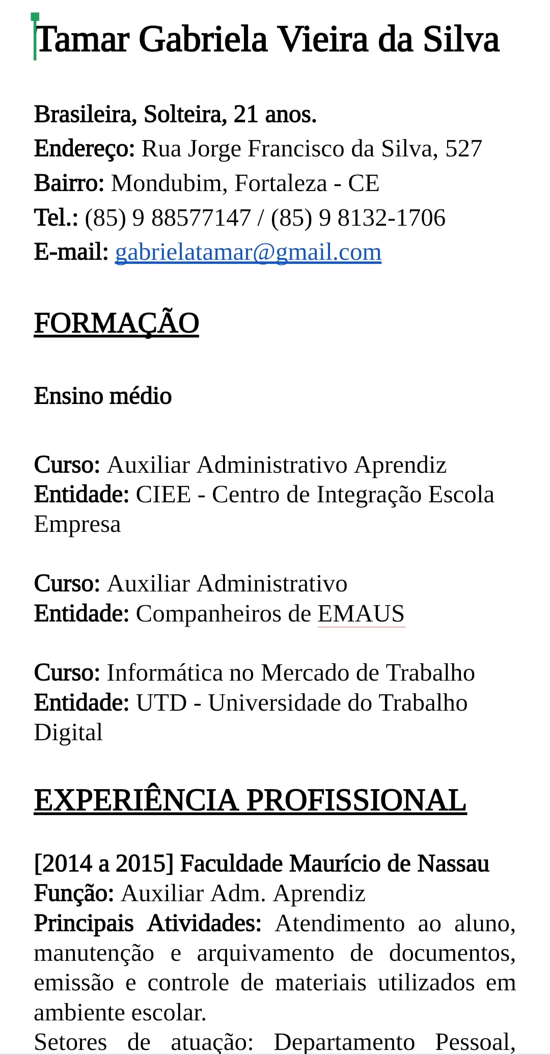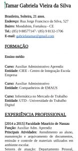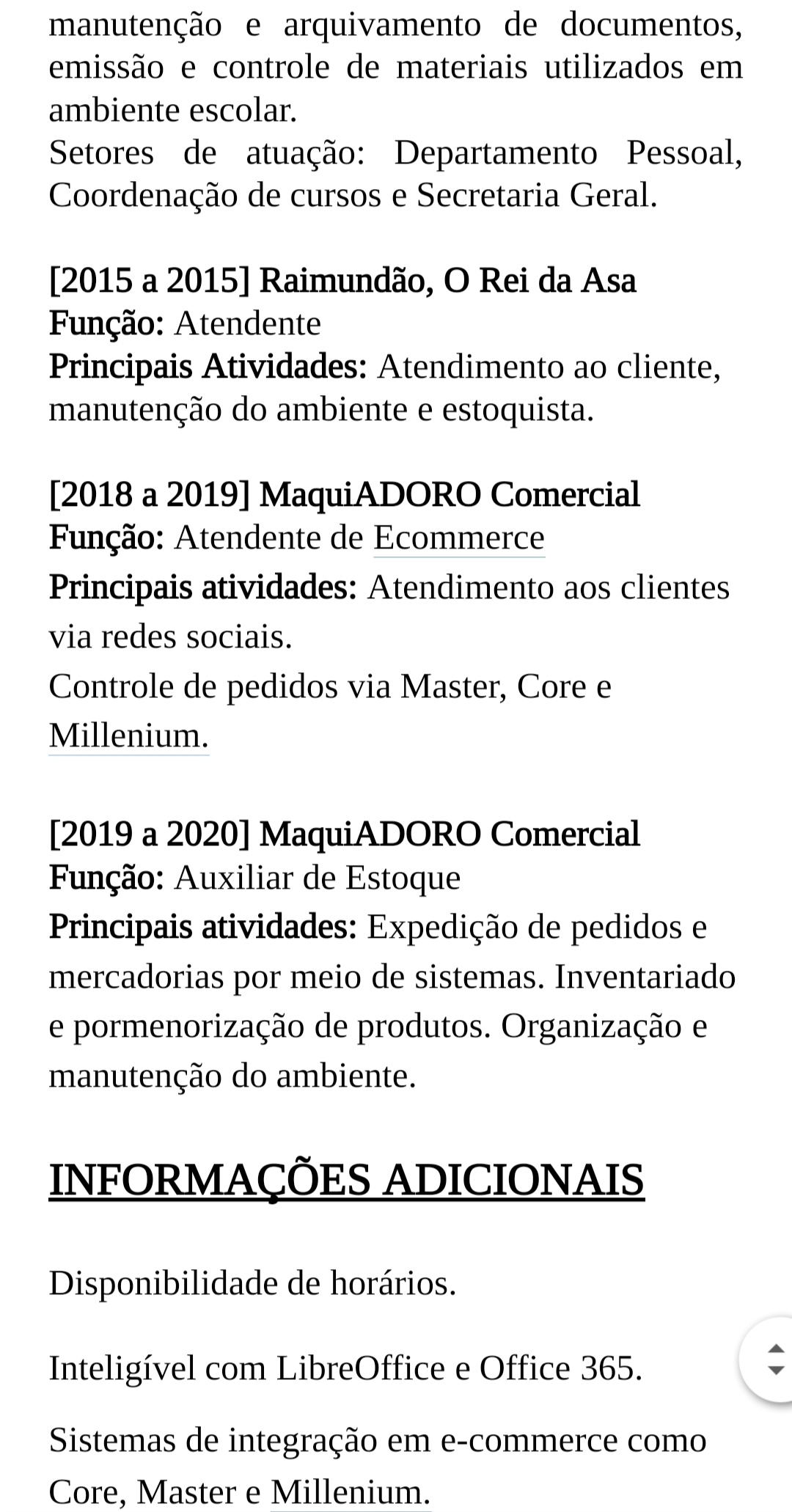 Sou responsável, focada, gosto de terminar o que começo e tenho meio que toque com perfeccionismo. Tenho experiência em atendimento, controle de estoque e rotinas administrativas. Interesse em aprender novas funções ou executar as que já tenho conhecimento.